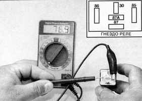 - Подсоедините положительный щуп омметра к клемме 30, а отрицательный - к клемме 87А и вновь измерьте сопротивление. Омметр должен показать проводимость(нулевое сопротивление).