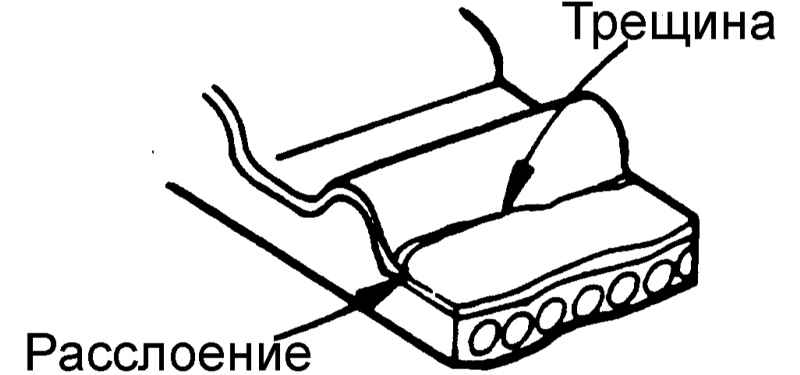 2. После ремонта двигателя или регулировки натяжение ремня, проверьте состояние ремня. При наличии следующих дефектов, замените зубчатый ремень.