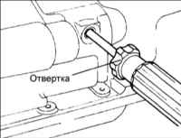 6. Перед отворачиванием гаек крепления шкива масляного насоса, сначала удалите заглушку с левой стороны блока цилиндров и в отверстие вставьте отвертку, чтобы заблокировать левый балансировочный вал в исходном положении. Отвертка, использованная для этой цели должна иметь стержень диаметром 8 мм, который может быть вставлен на глубину более 60 мм.
