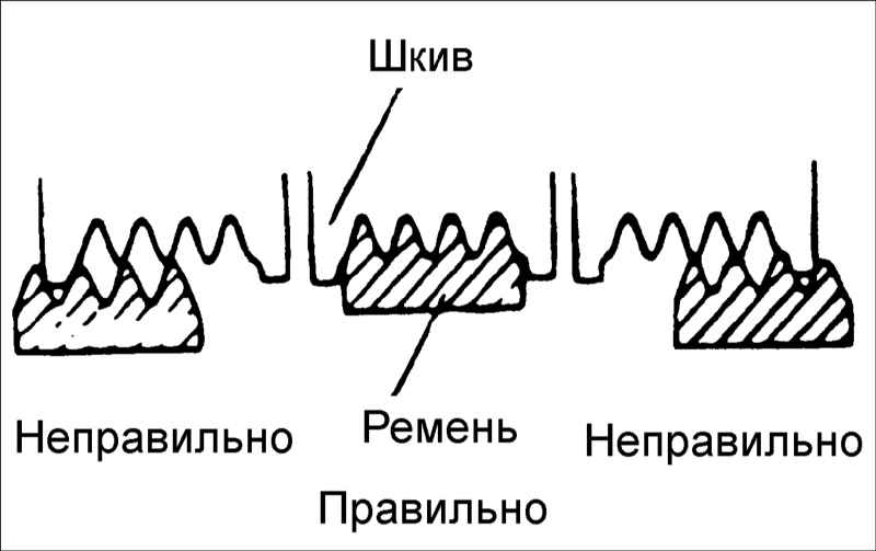 1. Проверьте правильность расположения ребер поликлинового ремня в канавках шкивов.