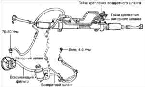 4. Отсоедините трубку, возвратный шланг и резиновый шланг от рулевой