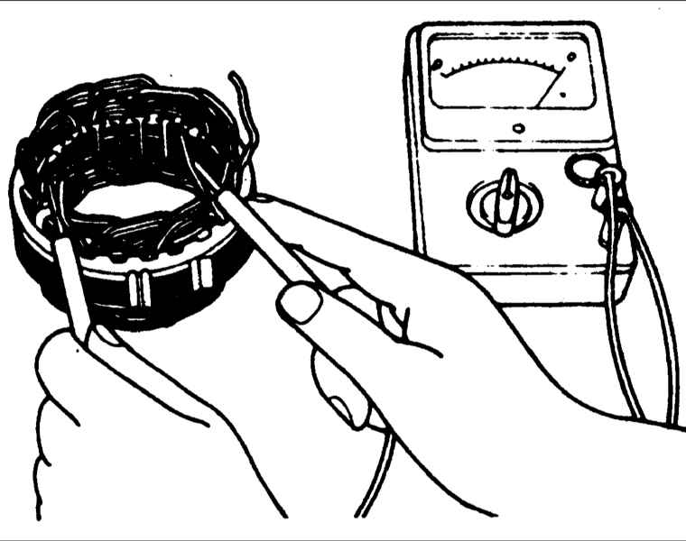 1. Омметром проверьте проводимость между проводами катушки статора. При отсутствии проводимости замените статор.