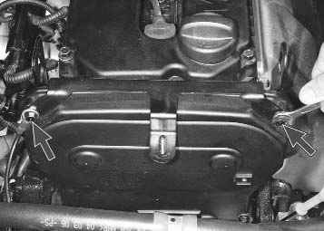 5. Выверните два нижних болта верхней крышки ремня привода газораспределительного механизма и снимите крышку.