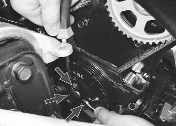 6. Зафиксируйте шкив привода водяного насоса от проворачивания, выверните три болта его крепления...