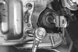 8. Отверните четыре гайки крепления вакуумного усилителя тормозов к панели передка...