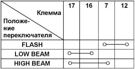 Органы управления и приемы эксплуатации). Удостоверьтесь в правильности распределения проводимости между клеммами №№ 17, 16, 7 и 12 (модели с SRS)/А1, А2, В2, В3, В4 и В5 (модели без SRS) контактного разъема сборки в каждом из штатных рабочих положений переключателя: LOW BEAM (Ближний свет), HIGH BEAM (Дальний свет) и FLASH (Сигнализация дальним светом) (см. таблицы). Неисправную сборку замените.