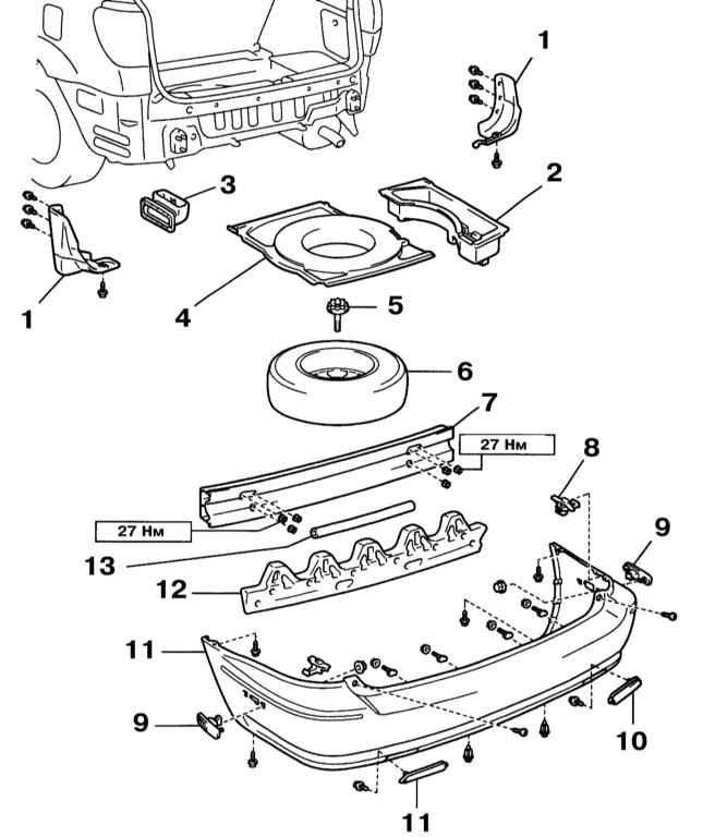 7 — Усиление заднего бампера 8 — Боковой кронштейн 9 — Боковой габаритный огонь 10 — Отражатель 11 — Панель заднего бампера 12 — Демпфер заднего бампера 13 — Штанга заднего бампера