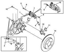 Рис. 6.51. Компоненты заднего тормозного механизма: 1 – трос стояночной тормозной системы; 2 – тормозная магистраль; 3 – зажим; 4 – зажим; 5 – крышка; 6 – болт; 7 – суппорт, тормозной шланг; 8 – чехол; 9 – тормозной шланг; 10 – суппорт; 11 – колодка тормозного диска; 12 – болт; 13 – опора; 14 – тормозной диск