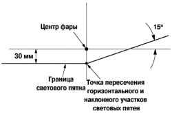 Вращая регулировочные винты, отрегулируйте фару так, чтобы точка пересечения горизонтального и наклонного участков световых пятен находилась в месте, показанном в заштрихованной области рисунка 7.25.