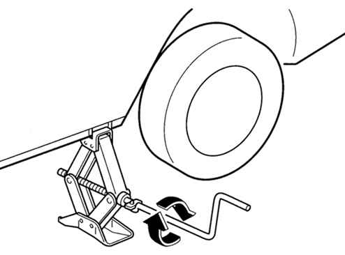 5. Вращая коленчатую рукоятку по часовой стрелке, поднимите автомобиль на высоту, достаточную для установки запасного колеса. Перед тем как отворачивать колесные гайки, убедитесь в том, что автомобиль устойчив и не может упасть с домкрата или самопроизвольно сдвинуться с места ( рис. 1.171).
