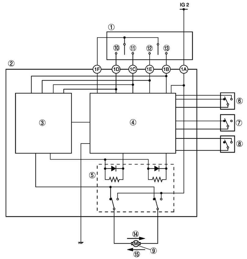 Рис. 8.56. Монтажная схема системы электролюка: 1 – выключатель люка; 2 – реле люка; 3 – цепь управления двигателя; 4 – схема обнаружения тока блокировки двигателя; 5 – реле; 6 – концевой выключатель № 1; 7 – концевой выключатель № 2; 8 – концевой выключатель № 3; 9 – электродвигатель люка; 10 – открыто; 11 – закрыто; 12 – наклон вниз; 13 – наклон вверх; 14 – открытие/наклон вниз; 15 – закрытие/наклон вверх