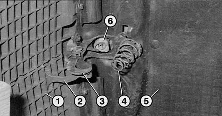 Рис. 11.5. Механизм открывания капота: 1 – облицовка радиатора; 2 – рычаг открывания; 3 – фиксирующий крюк; 4 – пружина открывания капота; 5 – капот; 6 – эмблема «Mercedes»