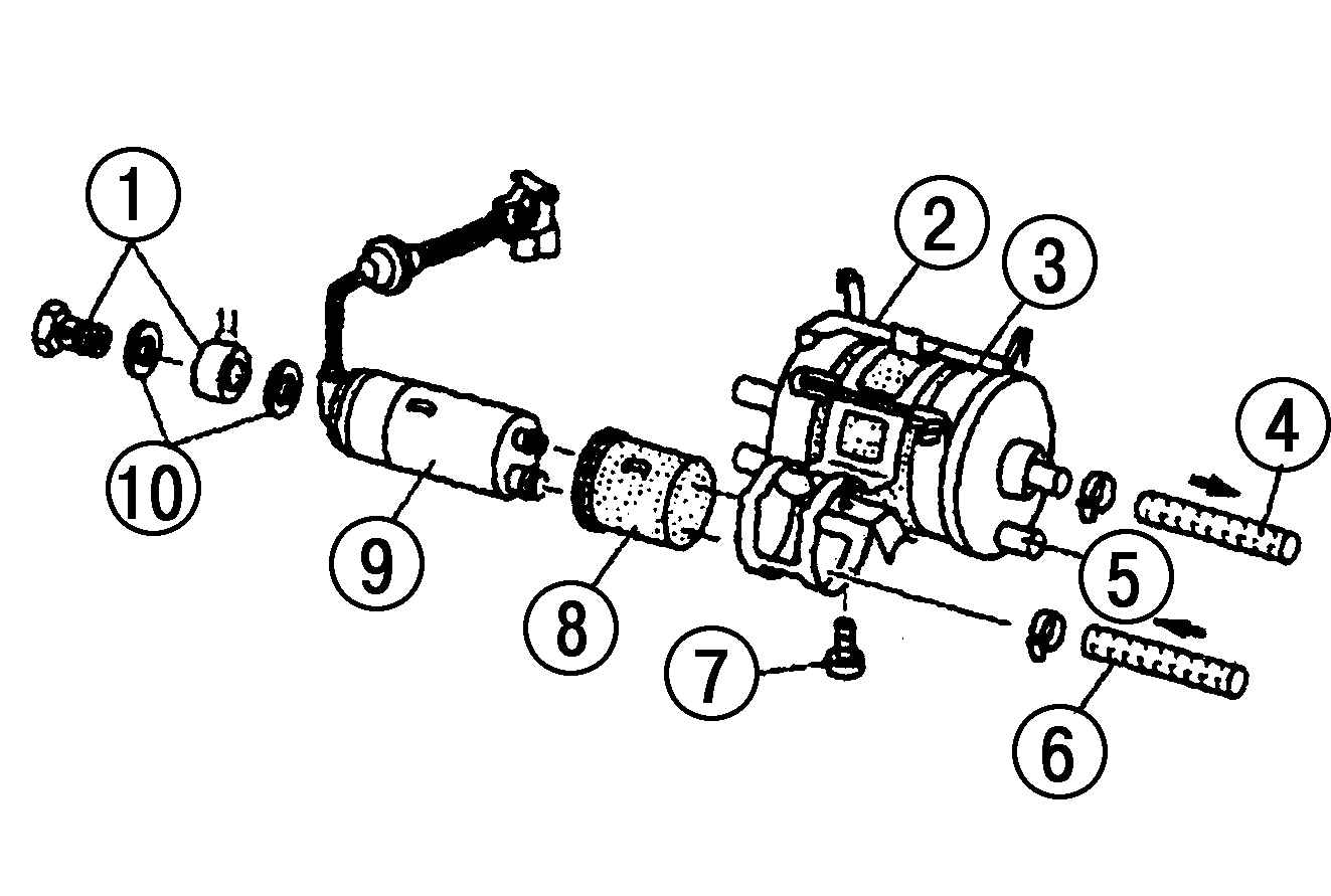 Рис. 5.50. Топливный насос с топливным фильтром: 1 – нагнетательный шланг с полым болтом (двигатель V6); 2 – кронштейн; 3 – топливный фильтр; 4 – нагнетательный шланг; 5 – штуцер шланга для удаления воздуха (двигатель V6); 6 – всасывающий шланг; 7 – болт; 8 – пластмассовая втулка; 9 – топливный насос; 10 – уплотнительное кольцо