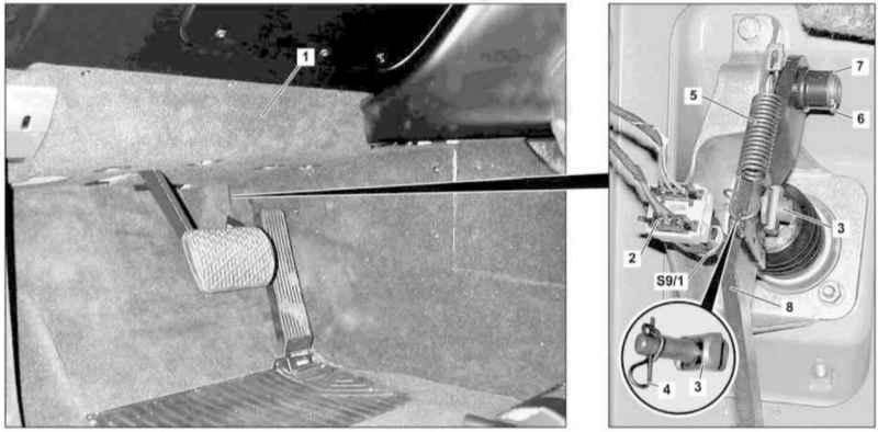 - Рассоедините разъем (2) электропроводки и снимите датчик-выключатель стоп-сигналов (S9/1).