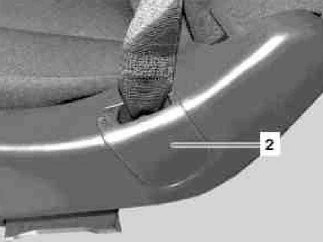 - Отпустив расположенную под облицовочной крышкой гайку, снимите направляющую скобу (3) ремня безопасности.