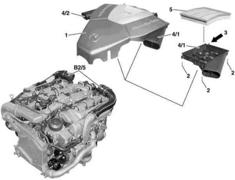 - Выверните болты (5) и отделите от крышки (4) воздухоочистителя воздухозаборник со встроенным датчиком MAF (В2/6), - проверьте состояние уплотнительного кольца, в случае необходимости приготовьте сменный элемент.