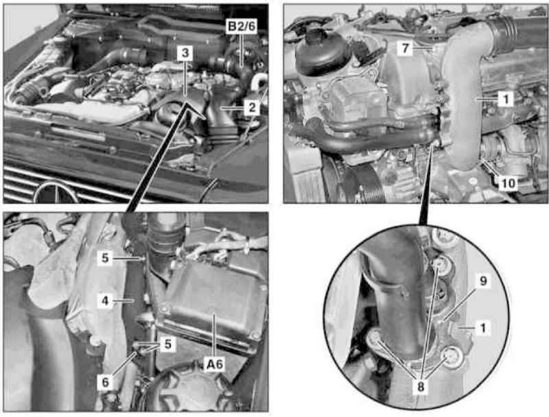 - Снимите правые нижний воздуховод (9) и входной рукав системы наддува (10) (см. выше).
