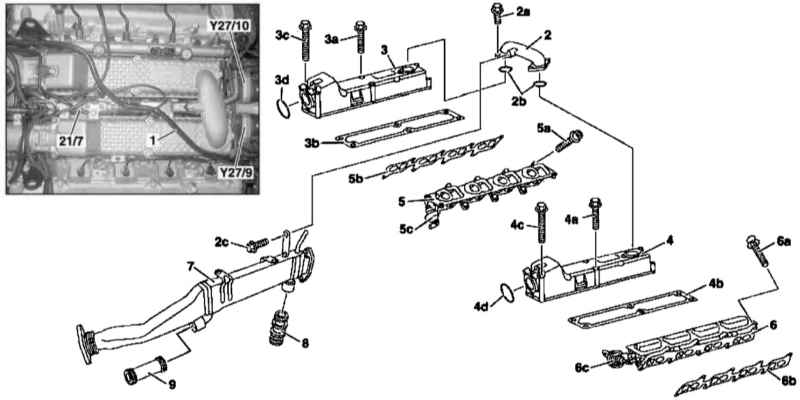 - Выверните болты (3а и 3с) и снимите верхнюю половину правой секции воздухораспределителя (3), - приготовьте сменную уплотнительную прокладку (3b).
