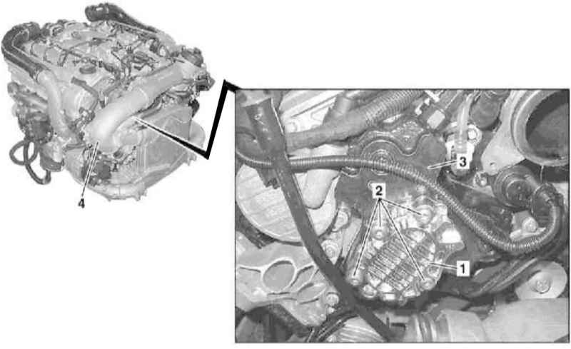 - Выверните крепежные болты (2) и снимите сборку предварительного топливного насоса (1), - приготовьтесь к сбору проливаемого топлива.