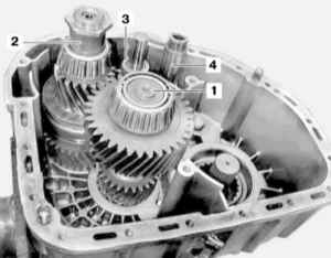 - Извлеките из раздаточной коробки входной (ведущий) (2) и промежуточный (1) валы.