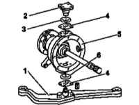 Нижний болт последними пятью миллиметрами в натяг посажен в сборку шарнирного кожуха (5), поэтому перед измерением регулировочных шайб между ним и внутренней обоймой подшипника необходимо установить дистанционное кольцо толщиной 6 мм. Еще одно кольцо толщиной 4 мм должно быть посажено между поворотным рычагом и шарнирным кожухом.