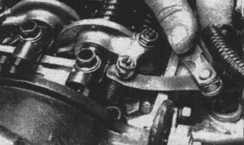 5. Регулировочные винты впускных и впрыскивающих клапанов расположены на коромыслах. Открутите регулировочный винт впускного клапана на два полных оборота, затем открутите контргайку на регулировочном винте впрыскивающего клапана.