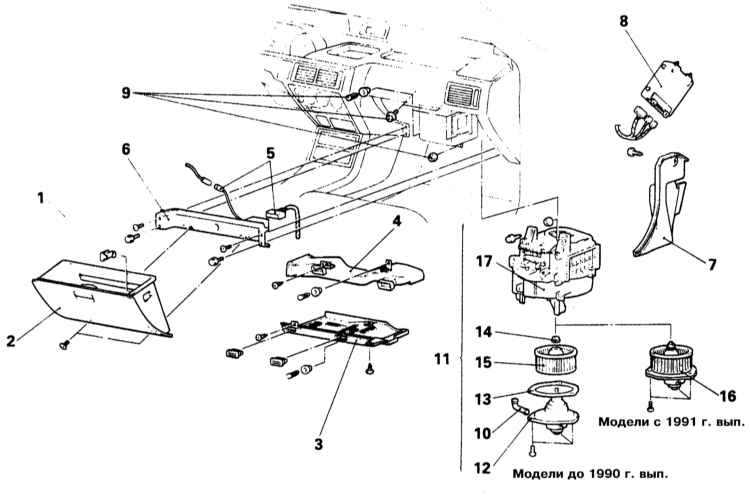 5.9. Замена электромотора привода вентилятора отопителяДетали установки вентилятора отопителя на моделях Mirage 1990 ÷