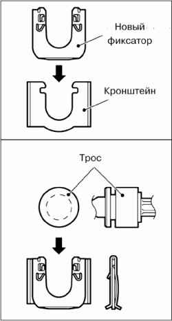 После установки нового зажима тяги переключения передач на кронштейн троса на коробке передач, установите трос привода переключения и трос выбора передачи в кронштейн троса.