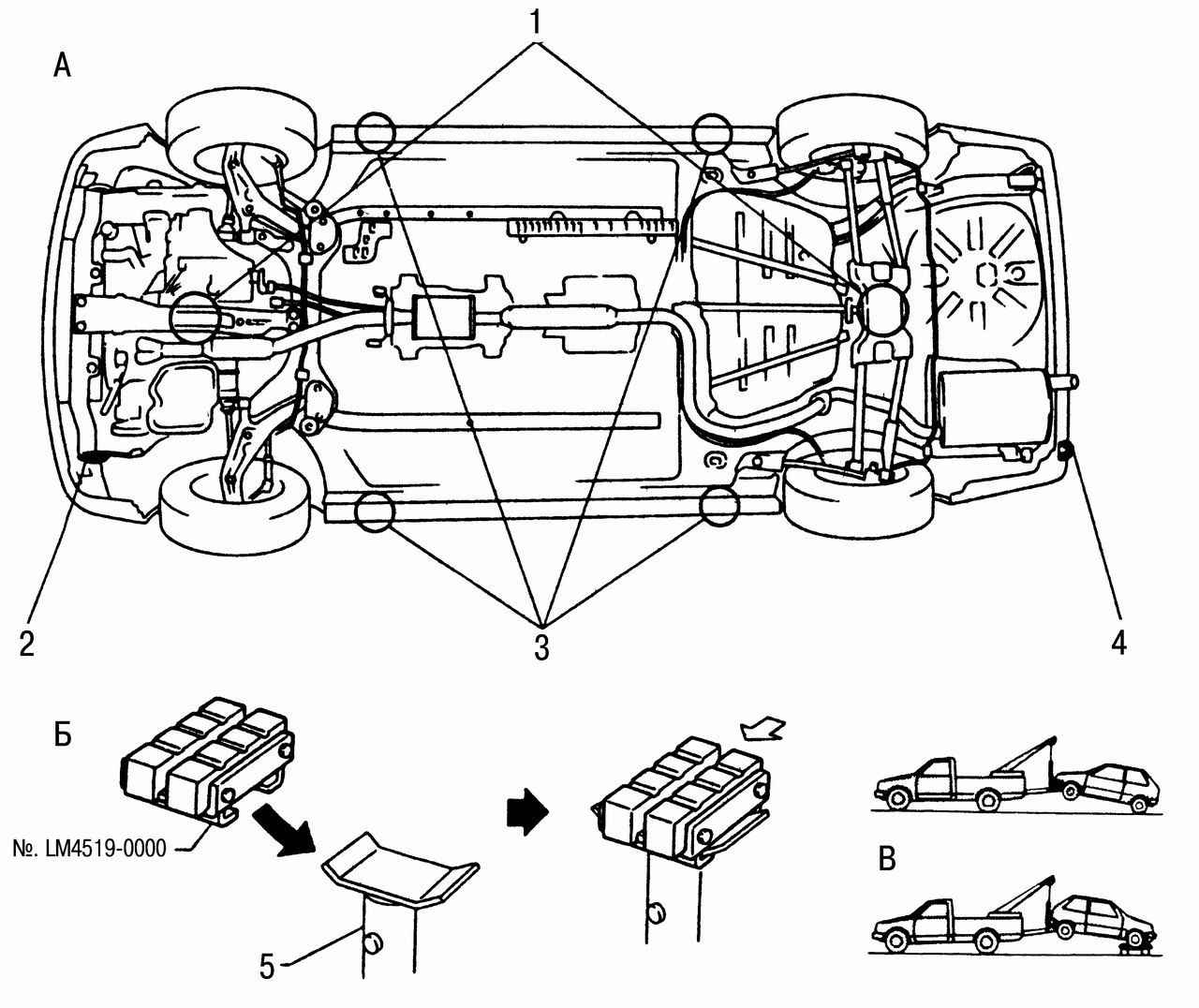 Рис. 1.2. Точки подъема и буксировка автомобиля: 1 — места для установки домкрата; 2 — передняя буксировочная проушина; 3 — места для установки предохранительных подставок; 4 — задняя буксировочная проушина; А — расположение точек подъема автомобиля; Б — установка проставки LM4519-0000; В — способы буксировки автомобиля