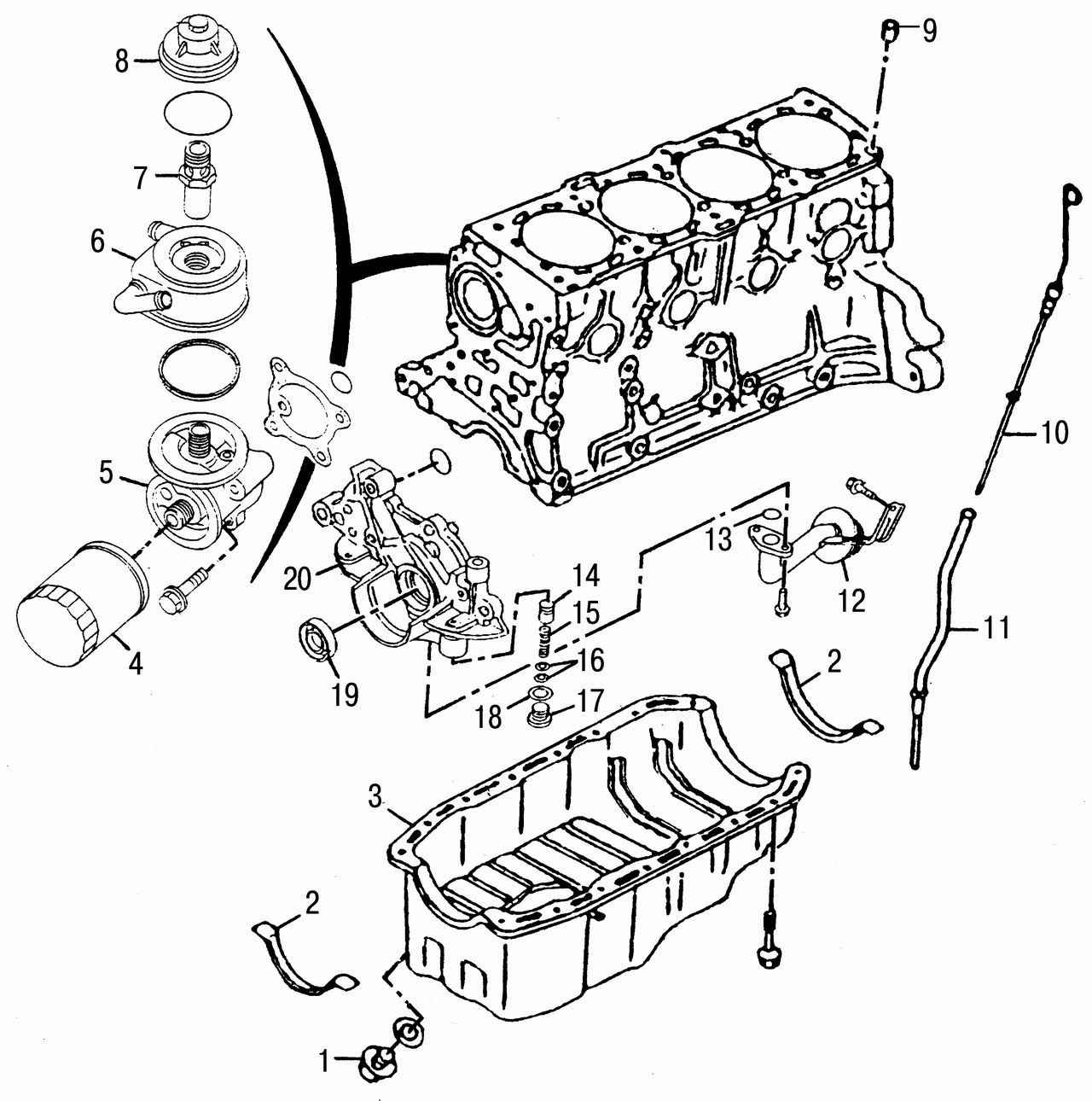 Рис. 3.26. Детали системы смазки: 1 — маслосливная пробка; 2 — прокладка; 3 — масляный картер; 4 — масляный фильтр; 5 — кронштейн масляного фильтра и теплообменника; 6 — масляный теплообменник; 7 — болт; 8 — крышка; 9 — блок цилиндров; 10 — маслоизмерительный щуп; 11 — горловина щупа; 12 — сетчатый фильтр; 13 — прокладка; 14 — редукционный клапан; 15 — пружина; 16 — шайбы; 17 — прокладка; 18 — пробка; 19 — сальник; 20 — масляный насос