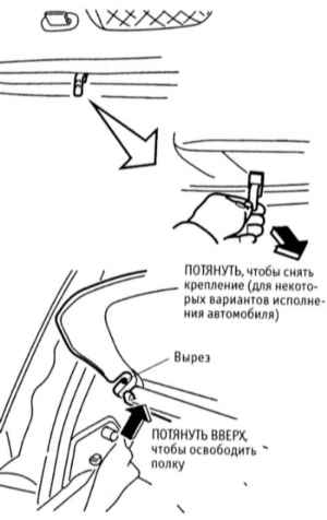 Инструкции по снятию полки багажного отделения приведены на иллюстрации ниже.