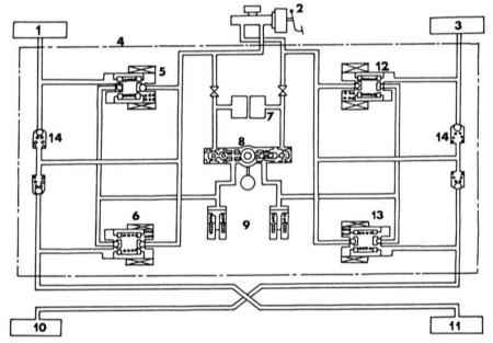 Кое-что следует сказать о гидравлическом насосе и пульсирующем демпфере (7) и (8). Насос подает жидкость к демпферу пульсаций и снижает давление в суппортах. Насос имеет эксцентрик. Когда насос через эксцентрик отжимает поршень в сторону, жидкость из расширительного бачка подается в демпфер, при этом открываются впускные и выпускные отверстия, и соединенные с ними клапаны. Поршень на другой стороне остается в своем положении, т. е. впускные и выпускные клапаны на этой стороне остаются закрытыми. Таким образом клапаны управляют опустошением и наполнением системы. Демпфер пульсаций накапливает тормозную жидкость под высоким давлением и