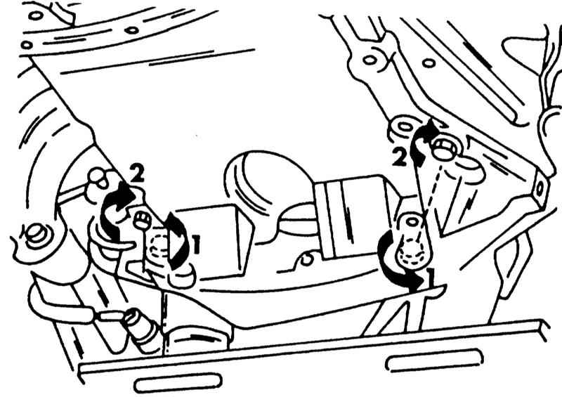 - Теперь поддон картера следует отжать от блока цилиндров так как он сидит достаточно прочно. Для этого следует руководствоваться иллюстрацией. На этой иллюстрации изображены два болта, удерживающие двигатель на коробке передач. Выверните болты в местах (1), а на местах (2) ввинтите и затяните, пока поддон не отойдет от блока. Затем осторожно отожмите поддон, не повредив при этом металл. Предварительно,