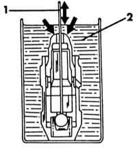 - Несмотря на то, что работа связана с некоторыми трудностями, воздух из элемента следует удалить, так как иначе при работе двигателя он будет стучать. Для удаления воздуха снова снимите элемент, вставьте в наполненный двигательным маслом сосуд, так чтобы нижняя сторона упиралась о дно. Нажмите пальцем на поршень и вставьте маленький стержень в отверстие клапана. Подвигайте стержнем вверх-вниз. При этом стержень нажимает на обратный клапан и вытесняет воздух. Воздух удален, когда поршень больше не двигается. На иллюстрации выше показаны элементы этой работы. Остальная сборка головки цилиндров идентична с ее установкой и уже была описана ранее.