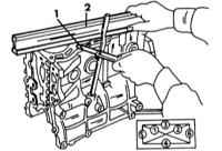 - Для этого наложите на поверхность блока стальную линейку (2) и измерьте зазор с помощью щупа (1). Измерьте блок в продольном поперечном и диагональном направлениях, как показано на маленькой диаграмме. Максимально допустимый размер составляет 0.10 мм. Следует помнить, что головка и блок цилиндров могут быть прошлифованы в общей сложности не более чем на 0.2 мм. Если головку шлифовать не нужно следует проверить высоту головки цилиндров, размер указан в