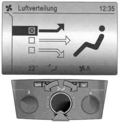Поверните средний регулятор, на дисплее будут последовательно отображаться возможные параметры настройки распределения воздуха. Распределением воздуха можно также управлять с помощью меню «Air distribut».