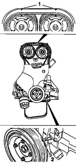 Рис. 2.70. Установка коленчатого вала в положение верхней мертвой точки (ВМТ) цилиндра № 1: 1 – метки на крышке головки блока цилиндров; 2 – метка на коленчатом вале
