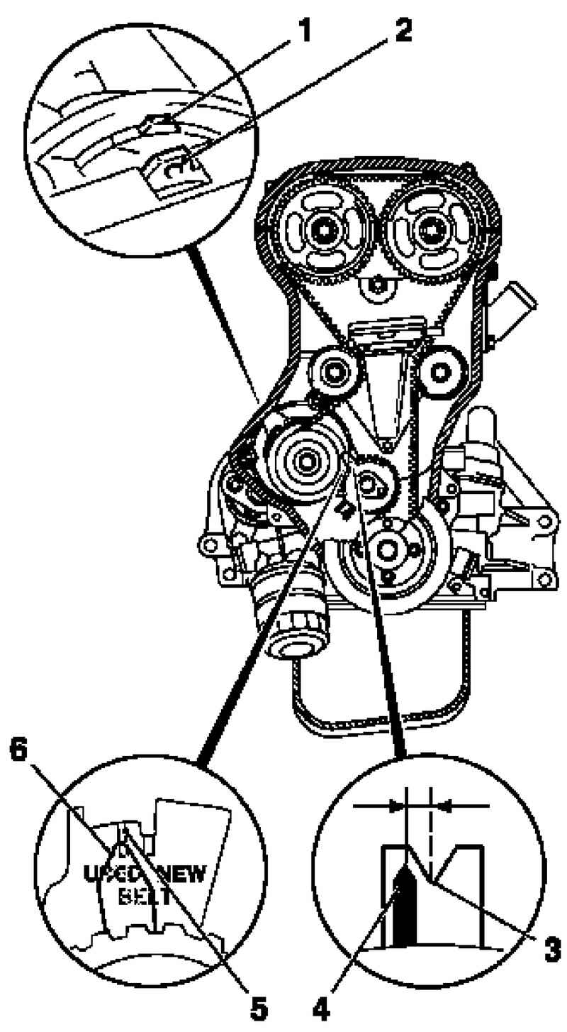Рис. 2.78. Проверка установочного положения насоса охлаждающей жидкости: 1 – прилив на блоке цилиндров; 2 – выступ насоса охлаждающей жидкости; 3 – паз; 4 – указатель натяжного ролика зубчатого ремня; 5 – метка «USED»; 6 – указатель натяжного ролика зубчатого ремня