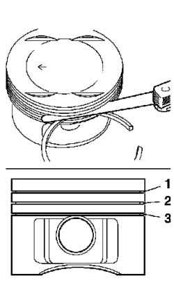 Рис. 2.236. Проверка зазоров поршневых колец: 1 – компрессионное кольцо прямоугольного сечения; 2 – коническое компрессионное кольцо; 3 – маслосъемное кольцо