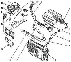 Рис. 2.304. Воздуховод системы улавливания паров топлива: 1 – корпус воздушного фильтра, верхняя часть; 2 – шланг воздухозаборника; 3 – шланг воздухозаборника турбонагнетателя; 4 – дроссельный патрубок; 5 – шланг воздуха наддува; 6 – турбонагнетатель с выпускным коллектором; 7 – шланг воздуха наддува; 8 – воздуховод наддува; 9 – промежуточный охладитель; 10 – шланг воздуха наддува; 11 – шланг воздуха наддува; 12 – резонатор; 13 – дренажная труба; 14 – впускная труба; 15 – корпус воздушного фильтра, нижняя часть; 16 – датчик массового расхода воздуха