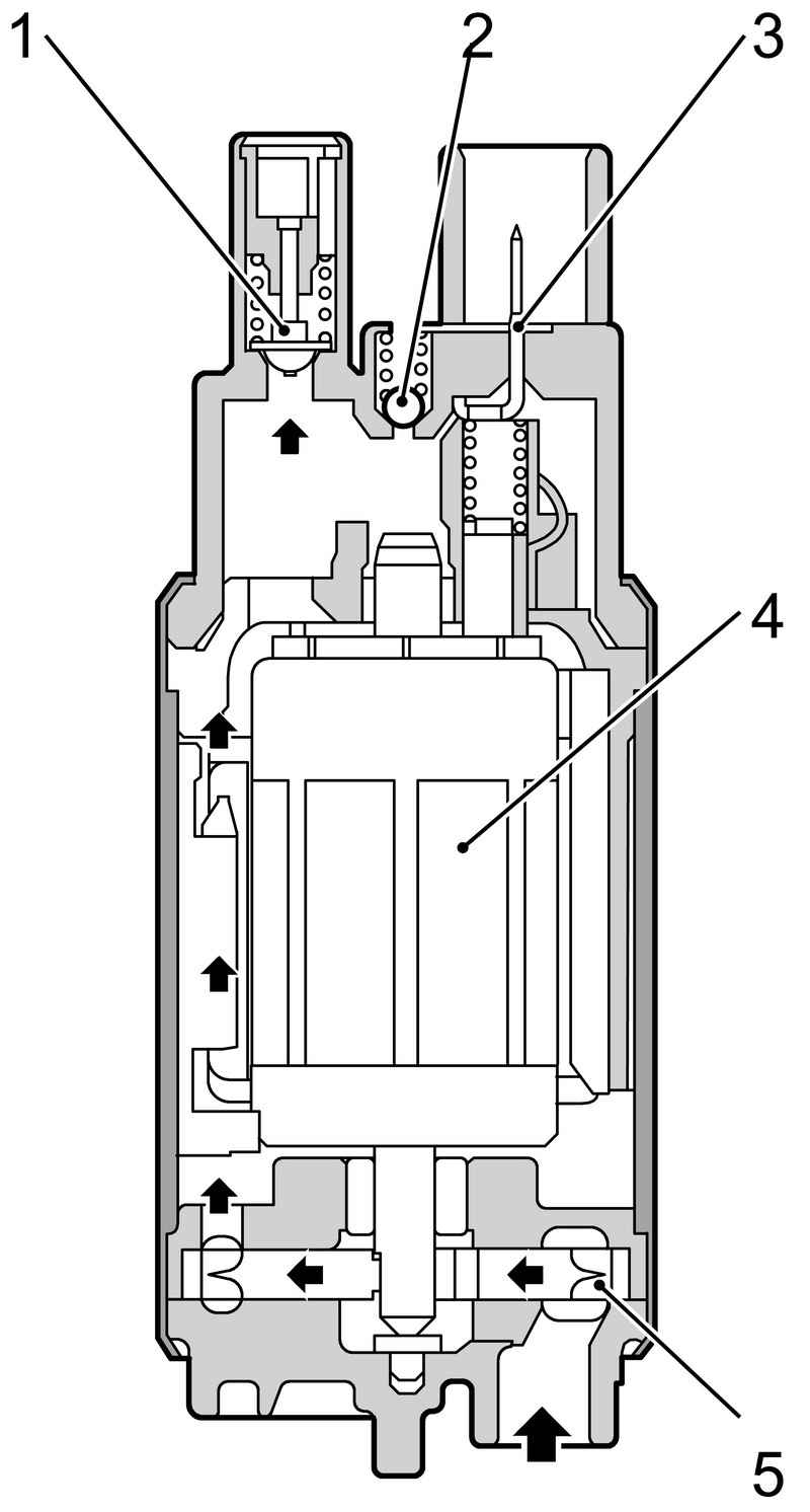 Рис. 2.273. Конструкция модуля топливного насоса: 1 – линия насоса предварительной подачи топлива; 2 – верхний корпус – модуль топливного насоса; 3 – ниже корпус – модуль топливного насоса; 4 – предфильтр; 5 – поплавок – уровень топлива