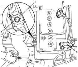 Рис. 3.17. Снятие аккумуляторной батареи: 1 – прижимная планка; 2 – массовый провод; 3 – плюсовой провод; 4 – болт