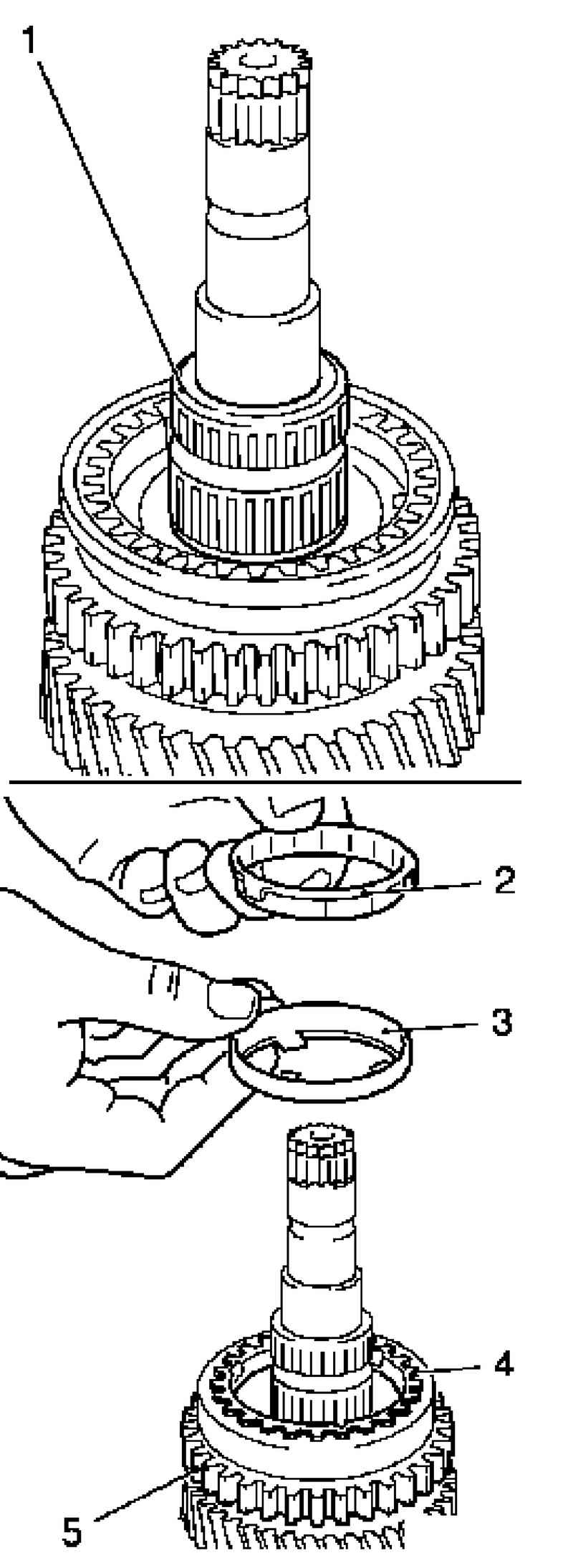 Рис. 3.94. Установка зубчатого колеса 2-й передачи на главный вал: 1 – внешнее кольцо синхронизатора; 2 – промежуточное кольцо ; 3 – внутреннее кольцо синхронизатора; 4 – зубчатое колесо 2-й передачи; 5 – блок корпуса синхронизатора
