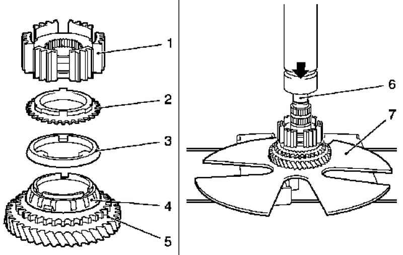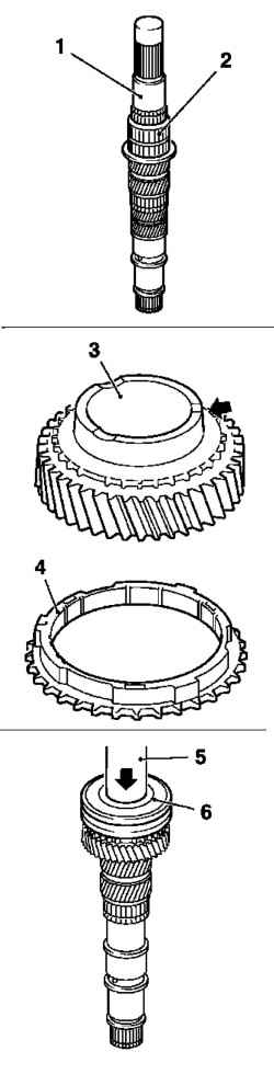 Рис. 3.90. Снятие зубчатого кольца 3-й передачи: 1 – игольчатый подшипник; 2 – зубчатое колесо 4-й передачи; 3 – втулка переключения; 4 – бородок; 5 – корпус синхронизатора 3-й/ 4-й передачи; 6 – зубчатое колесо 3-й передачи