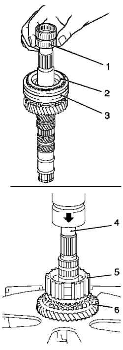 Рис. 3.92. Установка компонентов на главный вал: 1 – главный вал; 2 – игольчатый подшипник; 3 – зубчатое колесо 3-й передачи; 4 – кольцо синхранизатора; 5 – специальный инструмент; 6 – кольцо