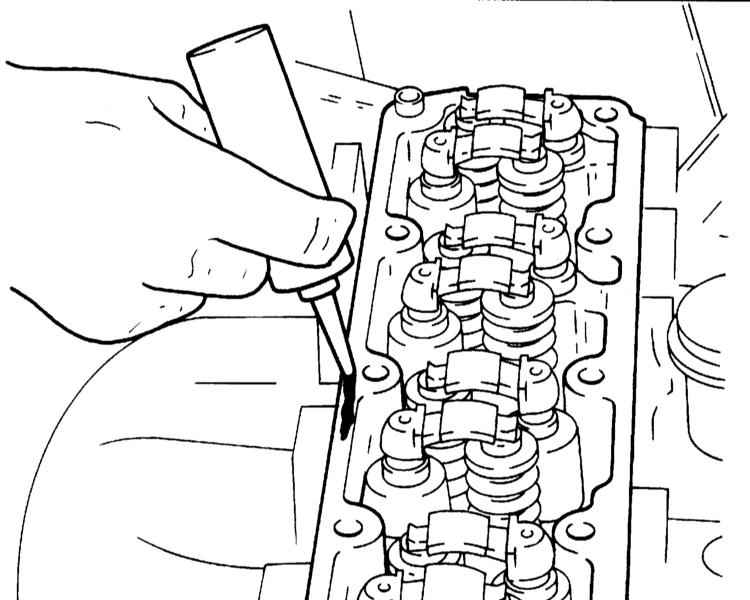 - Нанесите слой герметика OPEL ET-№ 15 03 166 на верхнюю сопрягаемую поверхность головки цилиндров.