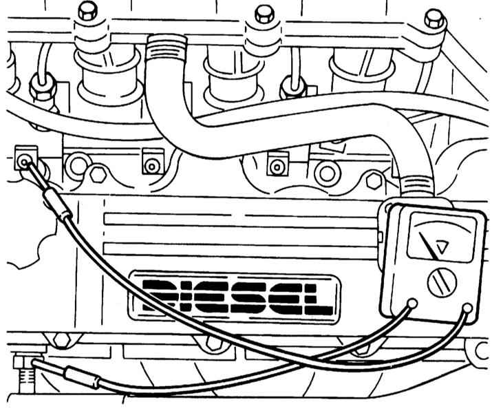 - Поверните ключ зажигания в положение II. Контрольная лампа устройства преднакала должна загореться примерно на 3.5 с, а вольтметр должен показывать наличие напряжение в течение примерно 7 с. В противном случае проверьте по электрической схеме реле преднакала или питающие провода.