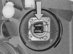 Вставьте новую лампу, не прикасаясь при этом к стеклу лампы, установите держатель лампы в корпус лампы и плотно привинтить винтами, зафиксируйте штекер кабеля, вставьте корпус лампы с фиксирующими штифтами в кузов и закрепите.