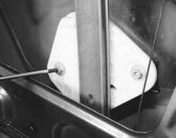 3. Приподнимите стекло настолько, чтобы ползун стеклоподъемника установился напротив технологического окна в панели двери. Придерживая стекло, выверните два винта крепления его обоймы к ползуну...