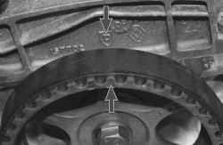 12. Проверьте совпадение меток на зубчатом шкиве распределительного вала и на крышке головки блока цилиндров.